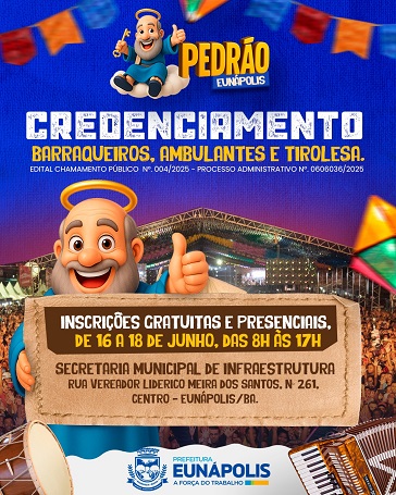 A Prefeitura de Eunápolis, por meio das Secretarias de Esporte, Juventude, Cultura e Lazer e de Infraestrutura, informa que está aberto o credenciamento de barraqueiros, ambulantes e operadores de tirolesa interessados em participar do Pedrão 2025, que será realizado de 26 a 29 de junho.