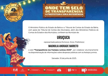O município de Uruçuca acaba de conquistar o Selo de Transparência nos Festejos Juninos, reconhecimento conferido pelo Ministério Público do Estado da Bahia (MP-BA), Tribunal de Contas dos Municípios (TCM) e o Tribunal de Contas do Estado (TCE). A certificação reforça o compromisso da gestão municipal com a responsabilidade fiscal e a correta aplicação dos recursos públicos durante os eventos de São João e São Pedro.