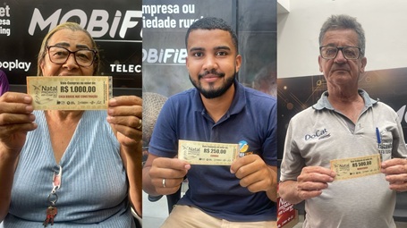 Ocorreu no início da tarde desta segunda 15 de dezembro o primeiro sorteio da Campanha Natal Premiado 2025 no município de Coaraci. Foram contemplados 16 ganhadores com Vale Compras de R$ 250,00, R$ 500,00 e R$ 1.000,00. Ao todo foram sorteados R$ 6.000,00 (Seis Mil Reais) em vale compras nessa primeira etapa. Os próximos sorteios acontecem nos dias 22 e 29 de dezembro e 05 de Janeiro, onde mais 97 ganhadores serão contemplados.